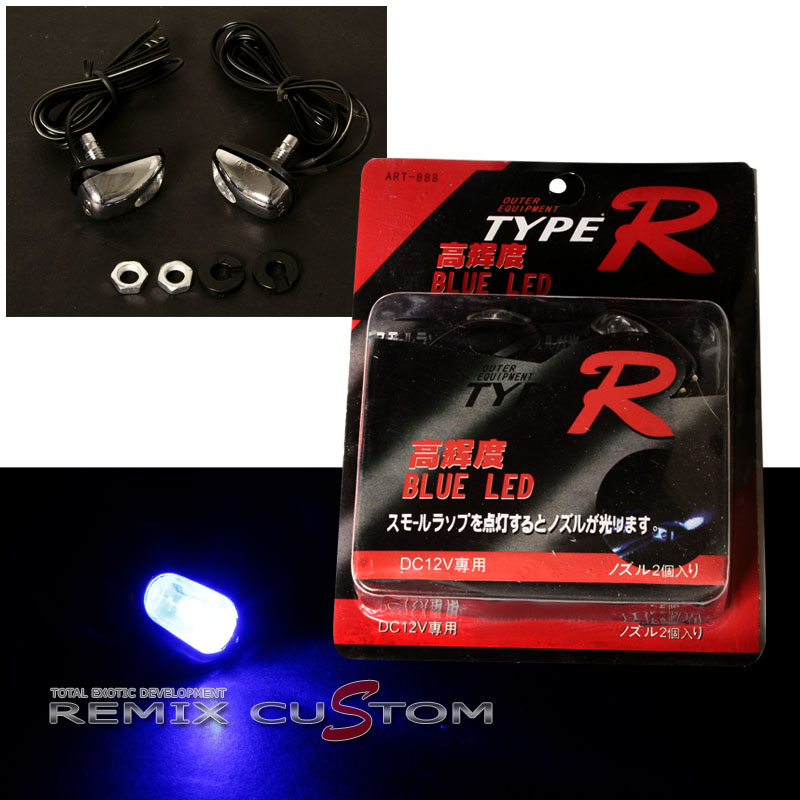 Chrome Windshield Washer Spray Nozzle with Blue LED Light. Customized with your parking lights or signal lights, anyway you want! This item is universal, fits all cars